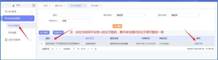 进入平台左侧导航窗口,依次点击师生双选管理——学生申报题目——查看详情,进行信息核对,如有错误,请第一时间报告指导老师。