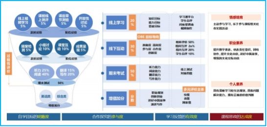 1.重过程,促进多元能力发展。过程性考核比重从30%加大到50%,构建基于项目式学习模式,通过系统化团队任务设计,全方位评价学 生的核心素养(动手能力、批判性思维、学科融合能力及团队协作能 力等)。实施增值评价,突破传统单一终结性评价模式,建立了融合 过程性与发展性的多元评价机制,如对“用英语讲好中国故事 ”“批 改网杯 ”竞赛、“正大杯 ”市场调查比赛等进行增值赋分。