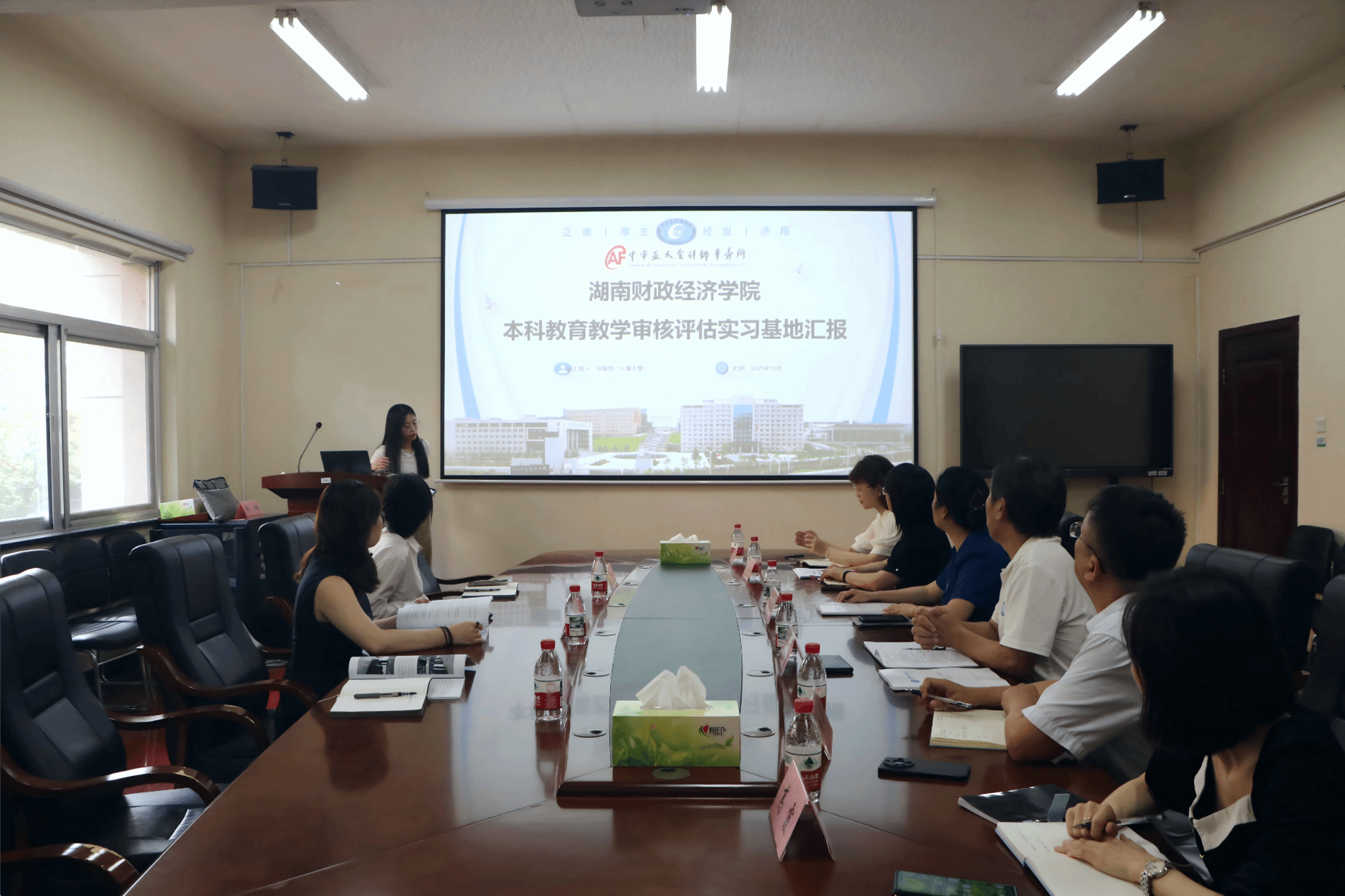 (本网讯)10月10日下午3点,在办公楼215会议室,会计学院组织召开中审亚太会计师事务所湖南分所实习基地审核评估推进会。中审亚太湖南分所所长曾静女士带队参会,学校质评办主任邓永红、教务处副处长张晓鹏、彭芊芮,会计学院党委书记戴恩湘、挂职副院长曾峻出席。会议由戴恩湘主持,以“全面复盘实习基地建设成效、精准优化校企合作模式”为核心,通过深化产教协同,助力学校应用型人才培养质量实现新提升。