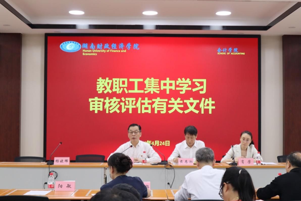 会计学院组织全体教职工共同讨论、认真学习了《普通高等学校本科教育教学审核评估实施方案(2021—2025年)》和《湖南省普通高等学校本科教育教学审核评估实施方案(2023-2025年)》等审核评估文件 。切实掌握本科教育教学审核评估的实质内涵与规范要求,从而有序推进学校审核评估工作。
