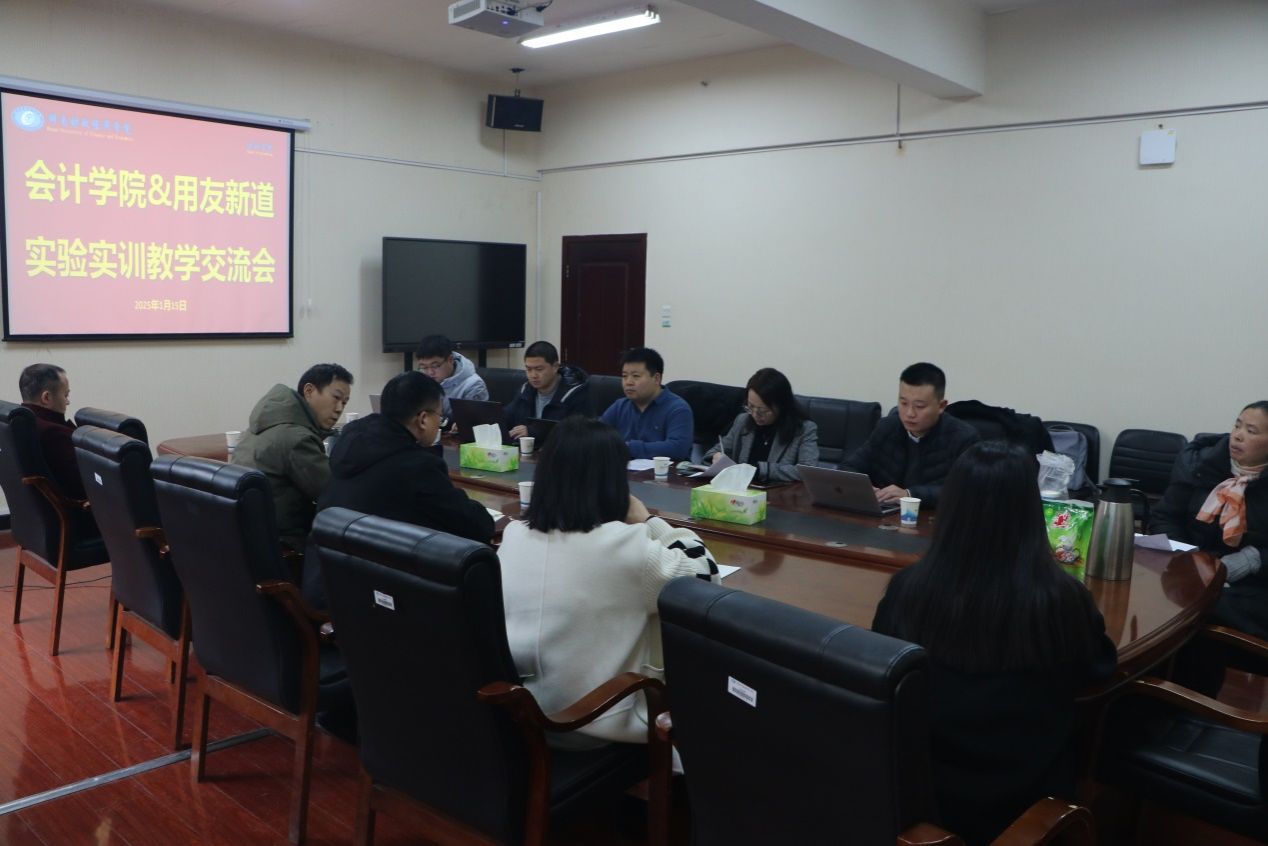 (本网讯)1月15日上午,会计学院与产业学院共建单位用友新道科技股份有限公司进行了实验实训教学沟通交流。新道科技股份有限公司教学研发总经理张路芳、技术开发总经理张纯旭、教育服务运维总监闫志超、湖南校企合作总监肖仁忠、湖南教学服务总监孙珣、湖南技术工程师陈捷,以及会计学院实验实训相关教师参加了会议。会议由学院副院长(挂职)曾峻主持。