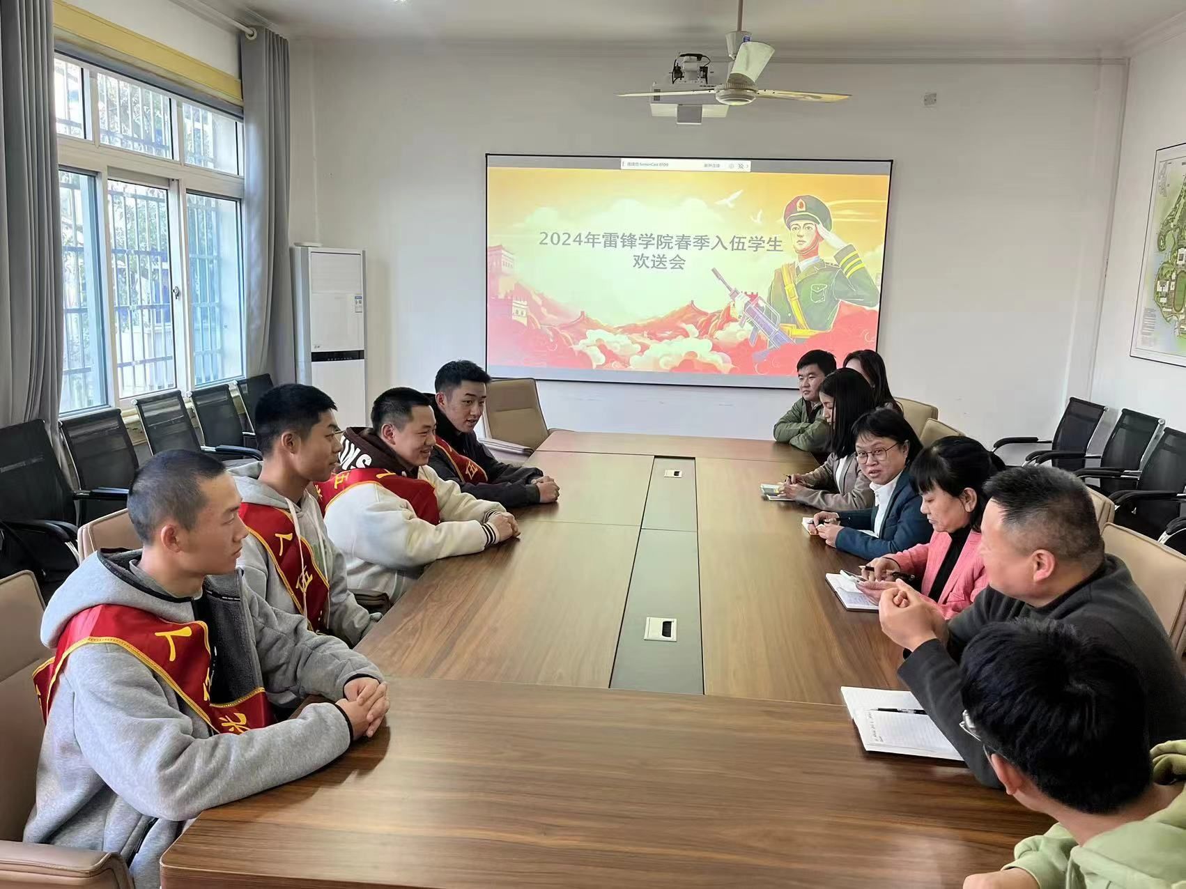 雷锋学院2024年春季入伍学生欢送会于3月12日在行政楼210会议室举行。学生工作部、武装部国防教育科科长熊弋帅、雷锋学院直属支部书记刘东艳、副书记黎红梅、学工办主任颜卫林与即将入伍的四名学生和相关辅导员参加了欢送仪式。会议由学工办主任颜卫林主持。