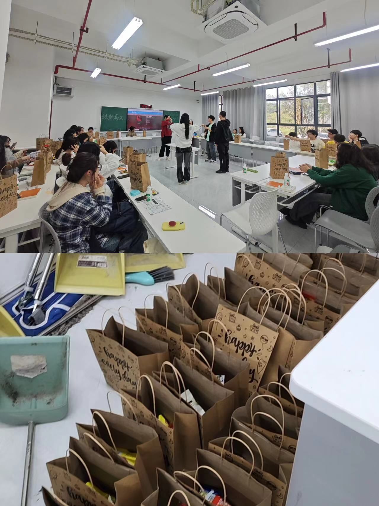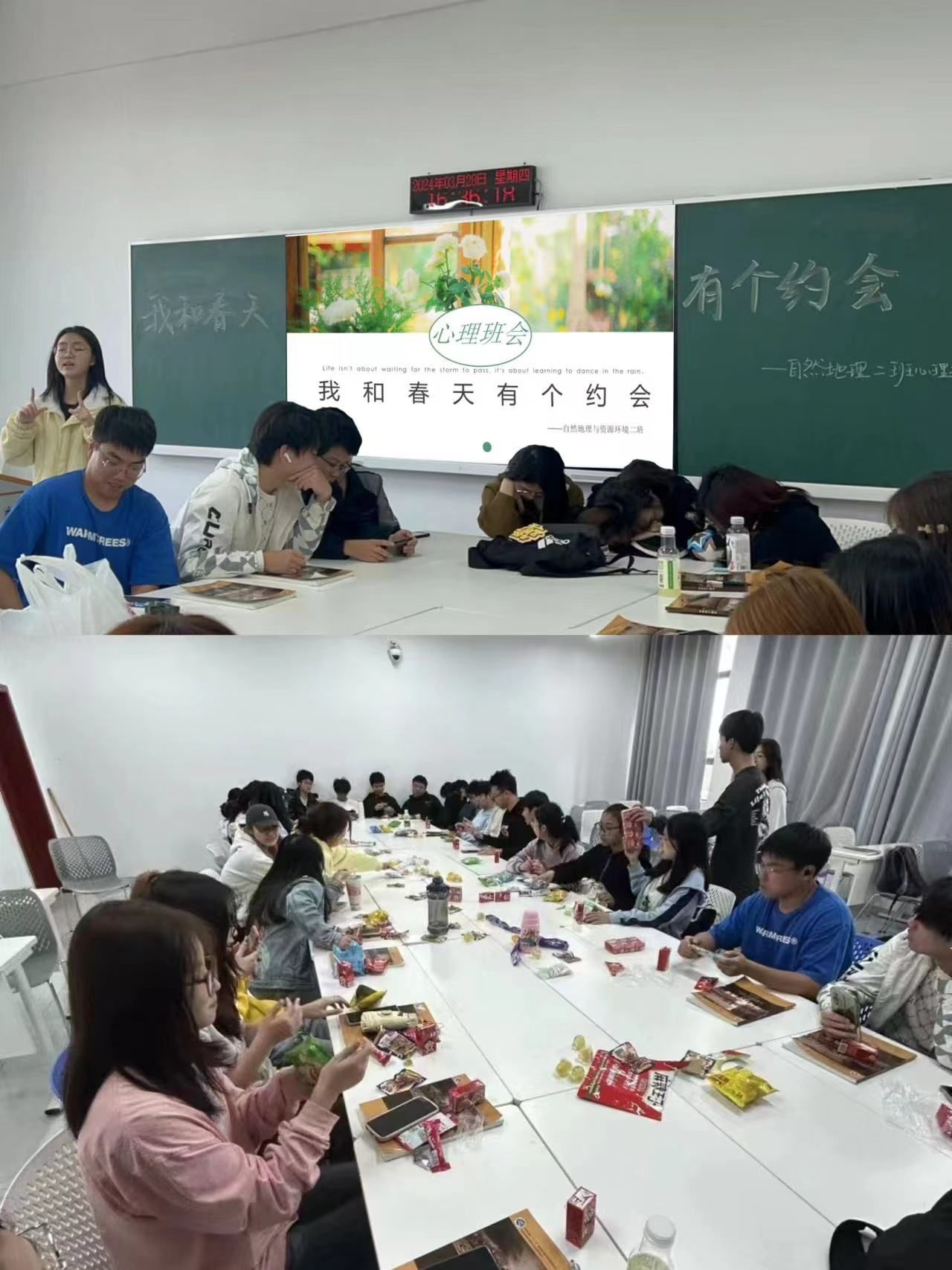 活动伊始,各班班干积极协作、同学间相互配合,精心布置活动现场,营造出温馨且充满活力的班级氛围;《因为你,因为我》和《让爱传出去》等舒缓而充满正能量的背景音乐贯穿于活动的始终,为现场增添了温暖和煦的气氛;心理委员通过放映精美的活动PPT引导同学们在音乐声中聆听和学习,感受和思考;此外,活动还设置了多个精彩纷呈的心理游戏和互动环节:同学们的才艺表演和“你画我猜”、“听歌识曲”、“我有你没有”、“击鼓传花”等游戏,让大家放松了心情,还学会了在生活中如何合理地调节情绪、缓解压力。这些有趣而富有启发性的活动形式,让同学们在欢声笑语中收获了成长与快乐。这次活动不仅是一次轻松愉快的集体活动,更是一次心灵交流与成长的旅行。同学们在活动中学会了欣赏美、感受美,同时也增强了班集体的凝聚力和向心力,彼此间更加珍惜团队友谊;随后,各班辅导员或心理委员对本次活动进行了总结,并鼓励同学们将春天的美好寓意融入到日常生活中,用积极的心态去面对生活中的挑战与困难,并告诉同学们要关注自己的心理健康,及时寻求帮助和支持;最后,全体同学在班会记录总结表上签名并表达了春季祝福。