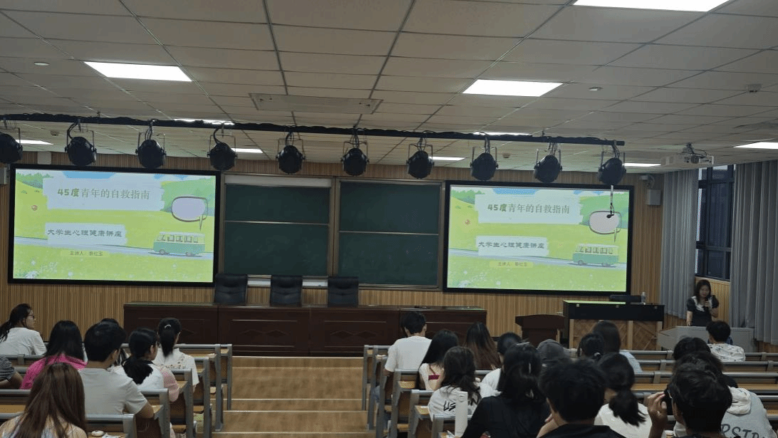 讲座现场,秦红玉老师以“躺不平、卷不动”的“45度青年”现象为切入点,结合学业焦虑、职业迷茫、自我认同危机等现实议题,运用心理学理论剖析青年群体的心理困境。秦老师以亲切的姿态和幽默的语言,带领学生探索个人价值观,并分享了“呼吸减压”“园艺疗法”等实操策略。