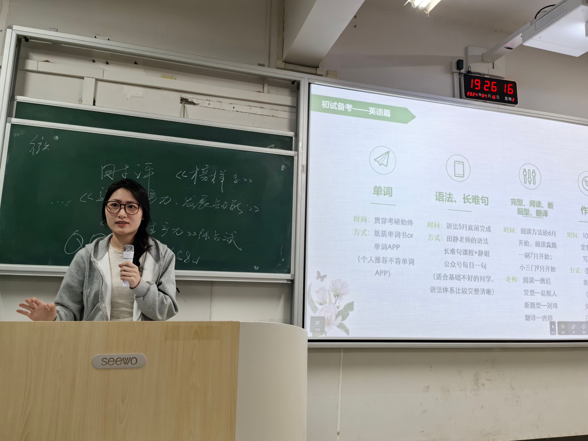 外国语学院舒星怡,考取北京航空航天大学硕士研究生。她分享了自己从日语专业跨考马克思主义理论专业的考研心得,着重为同学们讲解了如何调整考研复习心态,有效学习,拒绝内耗,立足自身设定计划,稳步前进。她提出,决定了就不害怕,努力了就不遗憾,踏路而行自有前程。