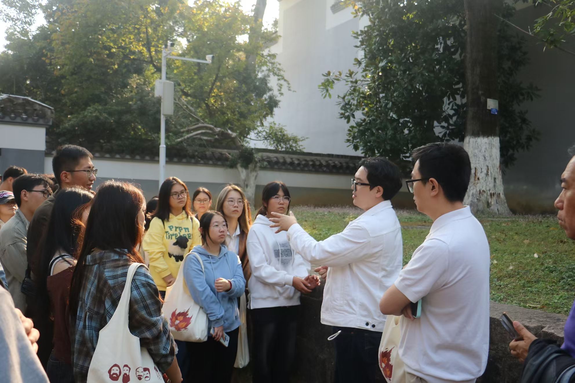 活动当天,24级思政教育一班的师生们走进了湖南大学。在东方红广场,同学们被这里庄重而神圣的氛围深深感染。辅导员苏扬波简要介绍了广场的历史背景与象征意义,引导大家深切体会革命先烈的伟大精神,并在广场前合影留念。