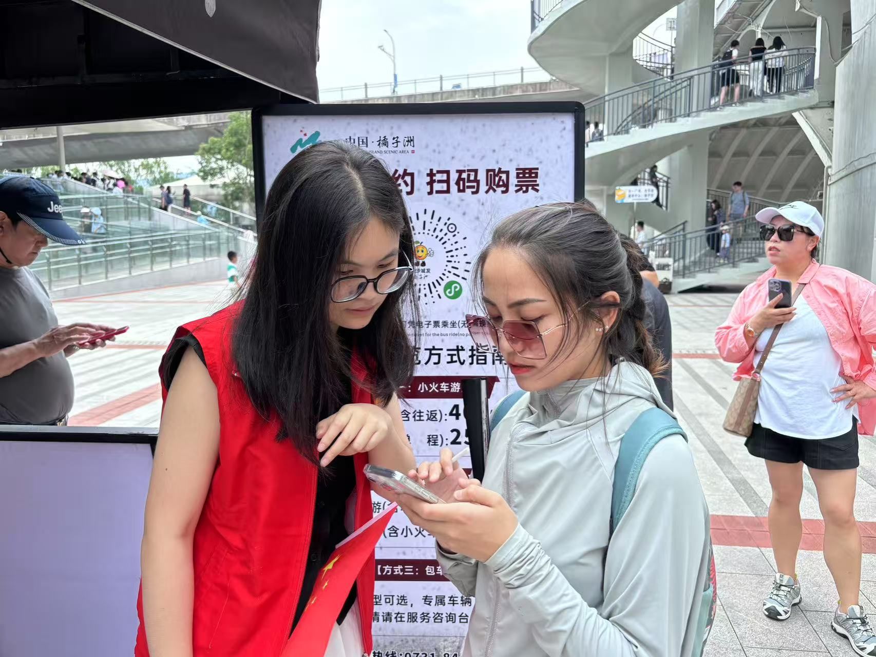 (图为我院学子为游客提供观光车购票指引)