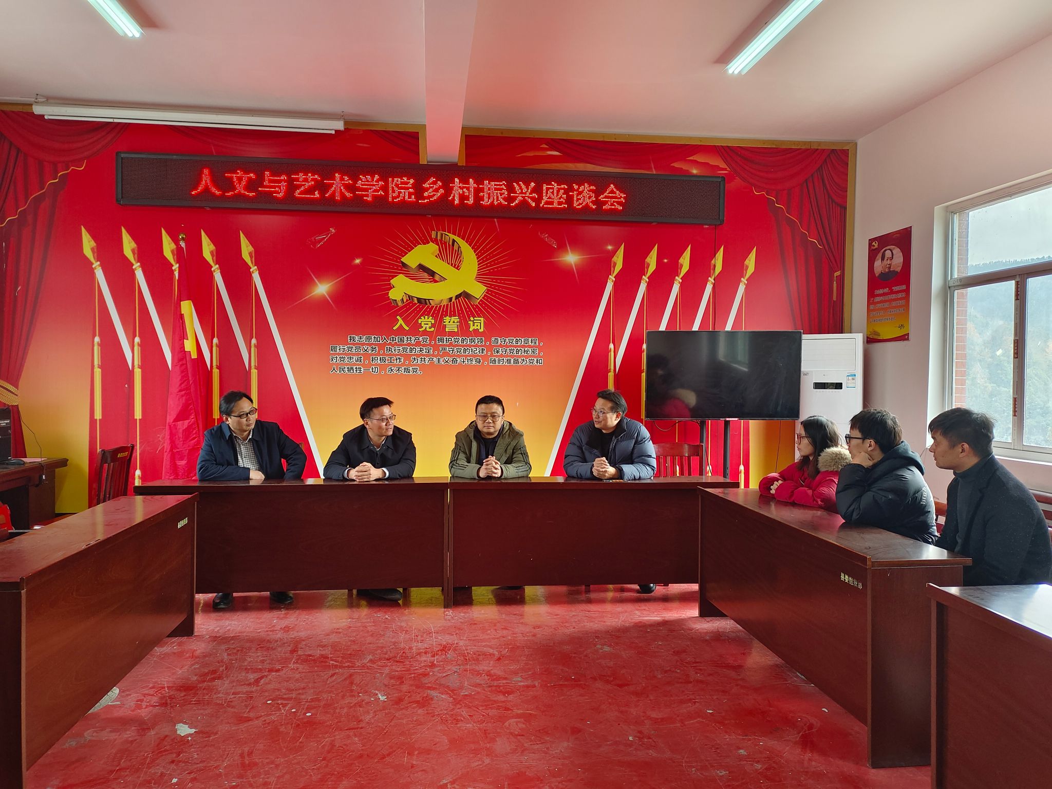 (本网讯)12月5日,人文与艺术学院党委书记葛干忠、院长林铁一行来到怀化市芷江侗族自治县牛牯坪乡青叶树村,围绕乡村振兴工作开展专题调研,并与驻村工作队及乡村干部座谈交流。牛牯坪乡人大主席陈政霖,驻村第一书记、工作队队长邓滔,青叶树村支部书记彭晓春参加座谈。