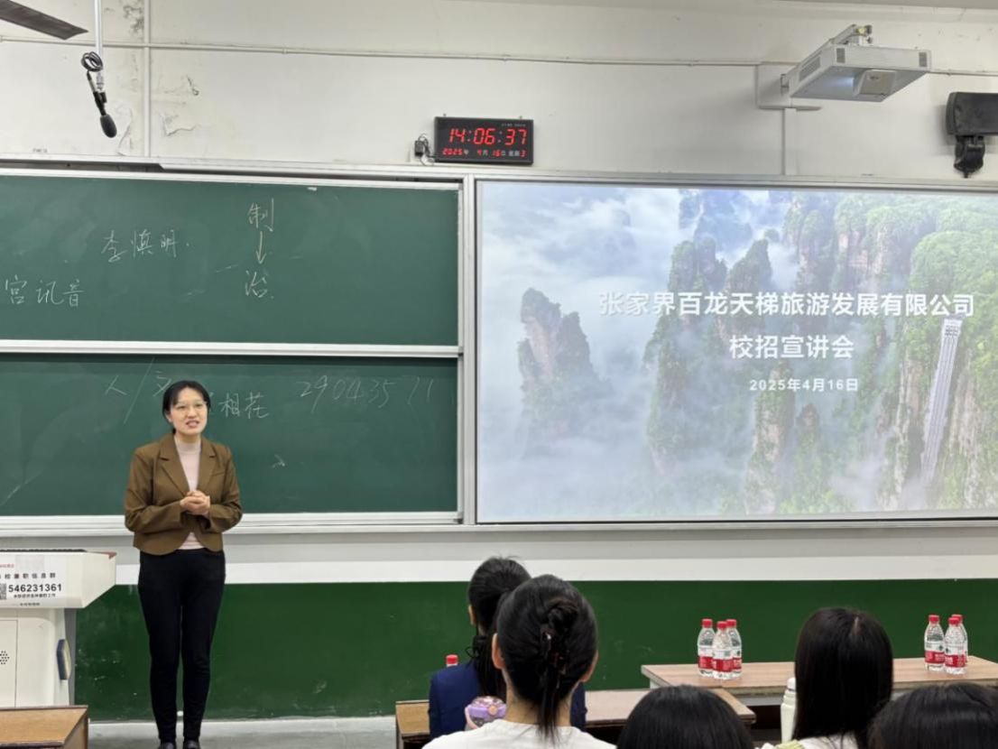(本网讯)为助力旅游管理专业学生精准对接实习岗位,拓宽职业发展路径。4月16日下午,旅游管理系组织第二批企业进校作实习宣讲。本次宣讲会邀请到广州长隆集团、张家界百龙天梯、长沙大王山假日酒店等企业参加,宣讲会由旅游管理系主任王亚辉主持,2022级旅游管理全体学生参加。