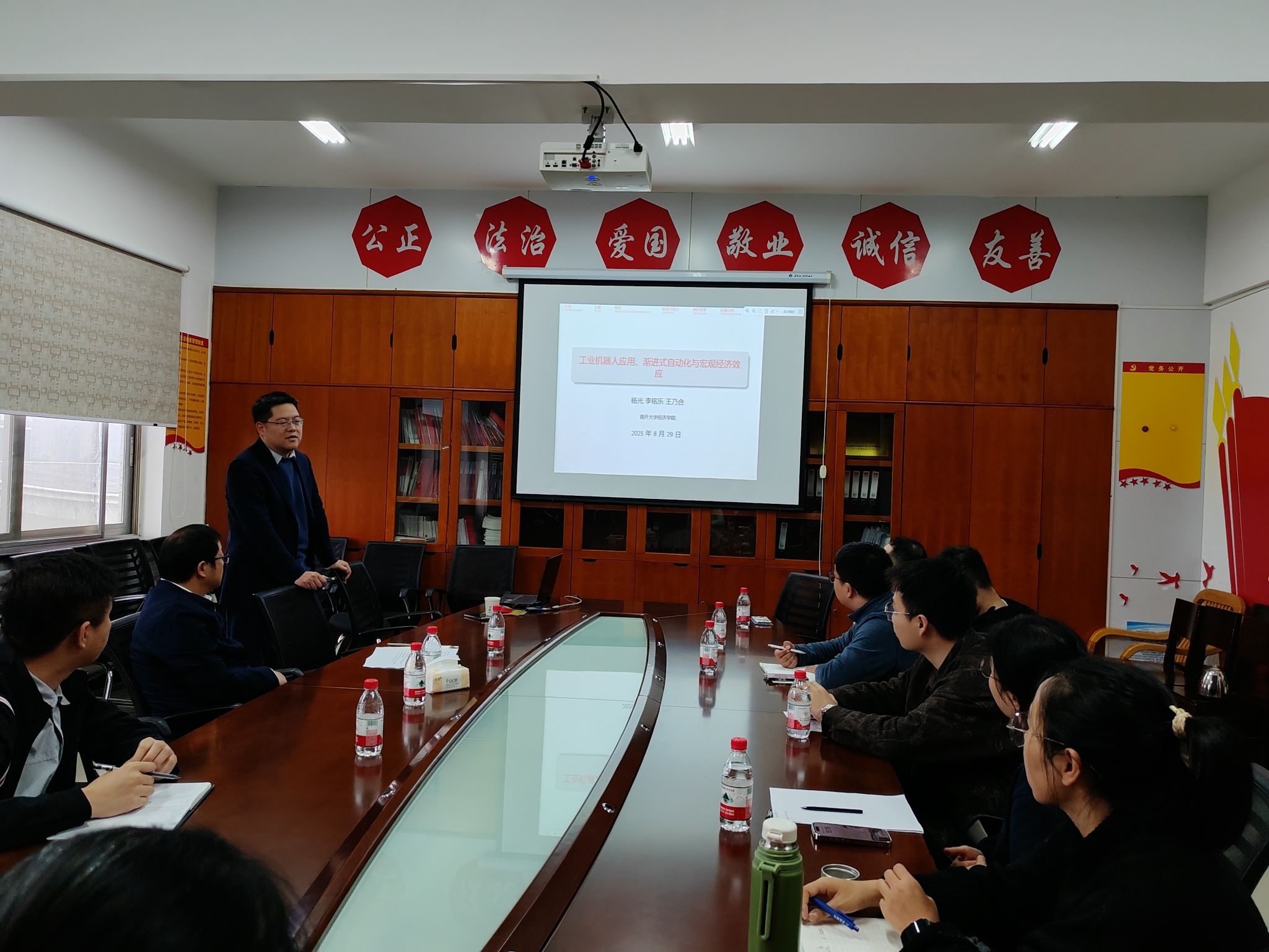 11月8日下午, 南开大学杨光博士应邀在办公楼809会议室做了一场十分精彩的学术报告。学院领导、年青博士参加。此次报告的主题是《工业机器人应用、渐进式自动化与宏观经济效应》,报告会由学院院长尹向飞主持。
