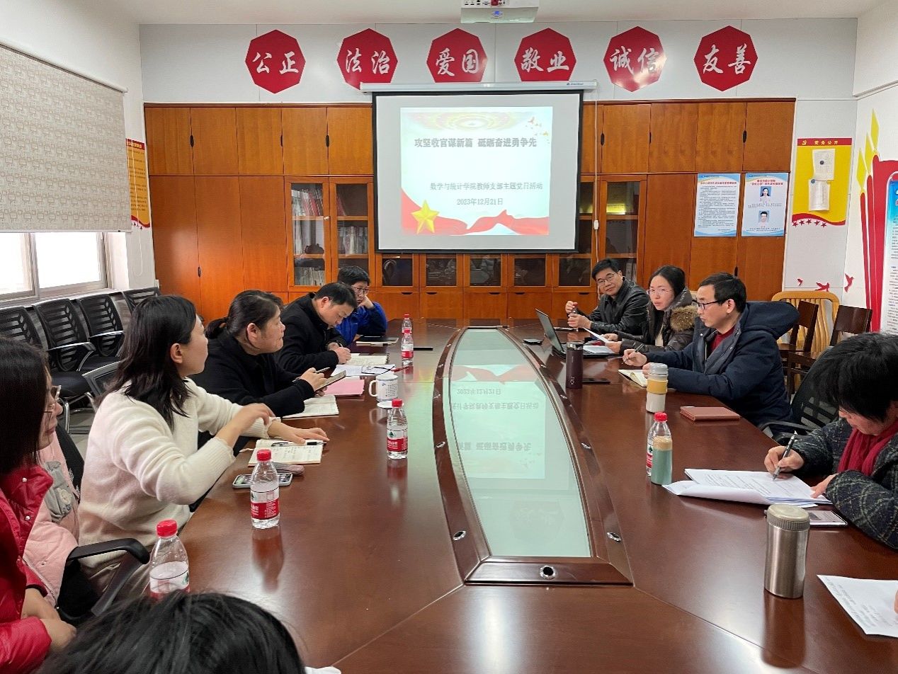 2023年12月21日下午,数学与统计学院教师党支部于办公楼809会议室开展“攻坚收官谋新篇,砥砺奋进勇争先”主题党课学习活动。本次党课活动由支部书记丁德琼主持,范国兵与易思维两位同志主讲,全体教师党员参加。