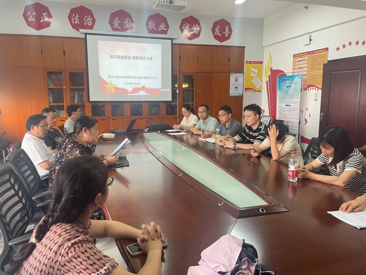2024年9月6日下午两点,数学与统计学院教师党支部于办公楼809会议室开展“筑牢思想根基,凝聚奋进力量”主题党课学习活动。本次党课活动由支部书记丁德琼主持,王萱、李兰平与陈丽萍三位同志主讲,全体教师党员参加。