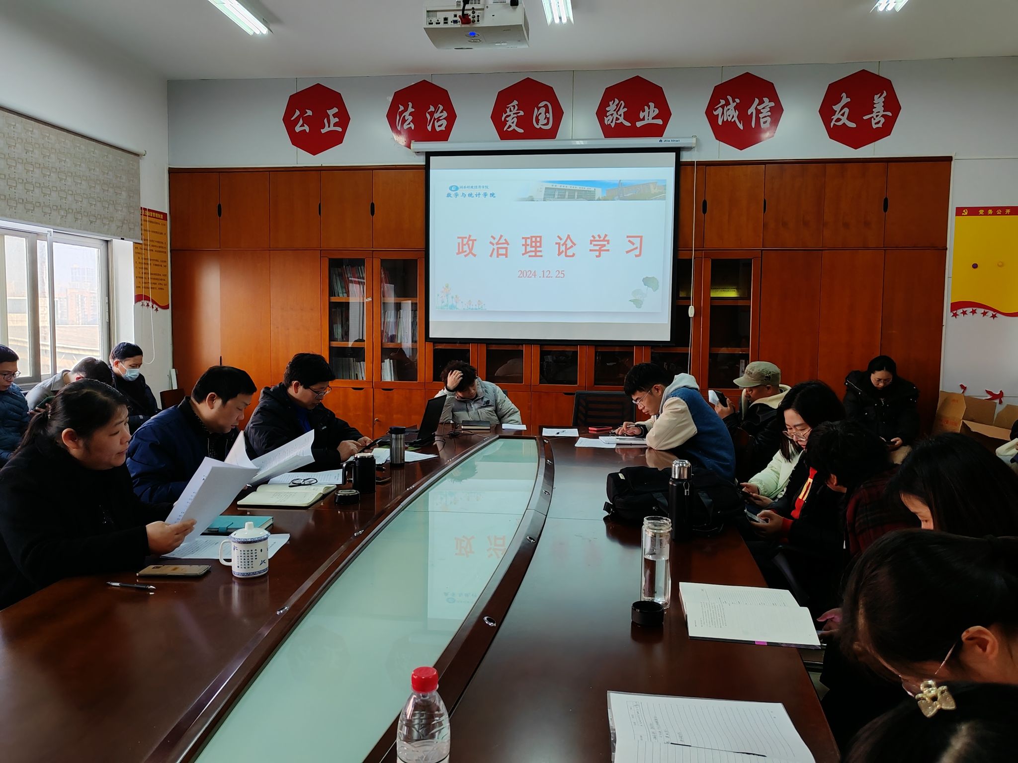 12月25日下午,数学与统计学院在办公楼809会议室召开政治理论学习和师德警示教育大会,会议由学院党总支部书记王萱主持,学院全体教职工参加会议。会议现场王萱在会议上传达了学校《关于开展教职工政治理论学习和加强师德警示教育的通知》,领学了习近平总书记关于教育的重要论述、2024年全国教育大会精神等重要内容,通报了教育部公开曝光第十批至第十三批违反教师职业行为十项准则典型案例,她强调每位教职员工要划“红线”,守“...