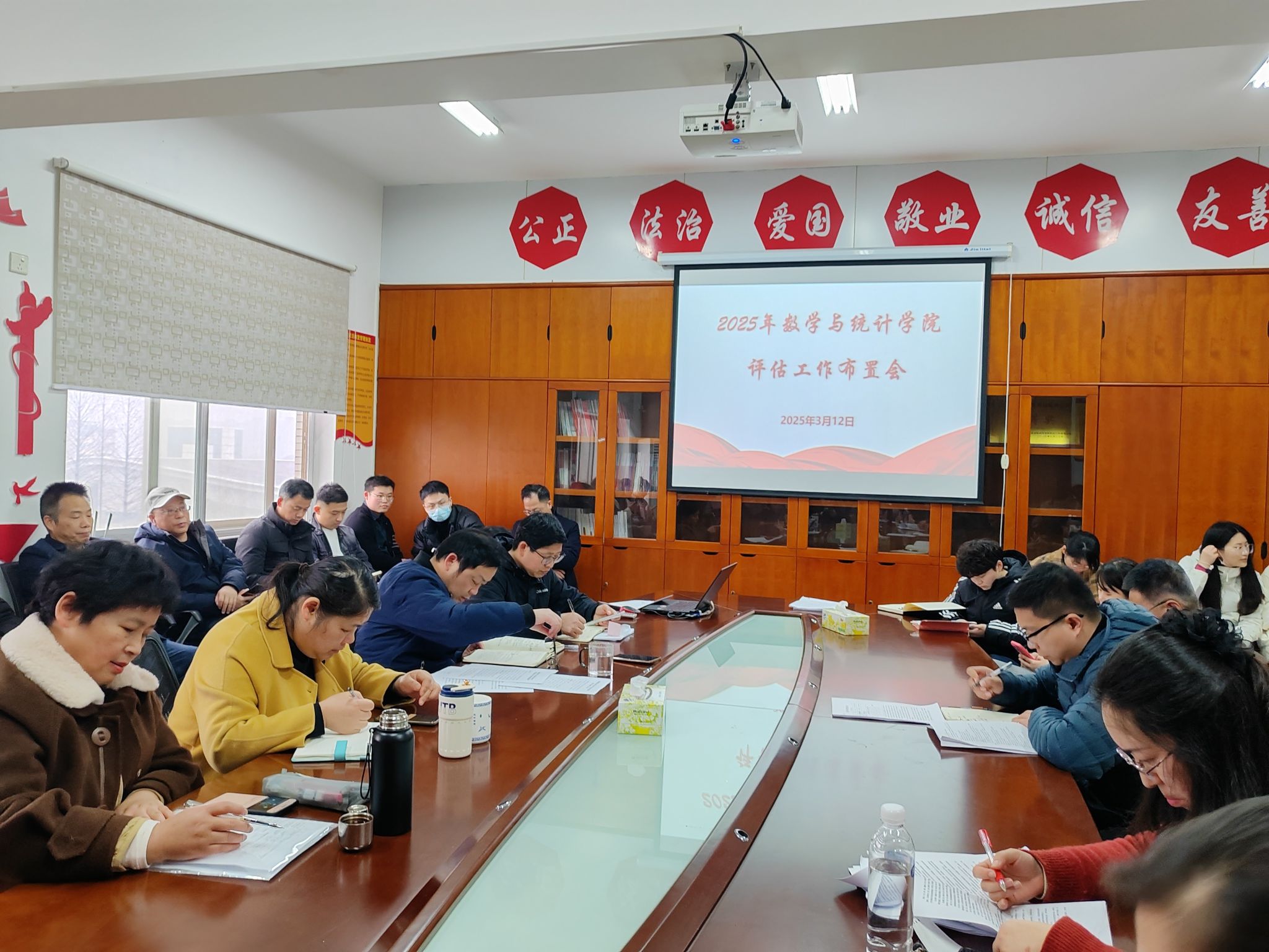 2025年3月12日下午,数学与统计学院在办公楼809会议室召开审核评估工作布置会,学院领导班子及全体教职员工参加,会议由学院院长尹向飞主持。会议现场尹向飞院长强调了本科审核评估工作的重要性。他指出,本科教学工作审核评估是对学院办学水平和教学质量的一次全面检验,全院上下要高度重视,严格按照评估指标体系要求,扎实做好材料整理和准备工作,确保评估顺利通过。副院长吕胜祥详细解读了《关于对审核评估评建指标达标和建设情况开展全面检查的通知》...