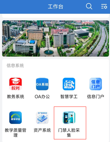 2.点击下方导航栏“工作台”,点击“门禁人脸采集”。