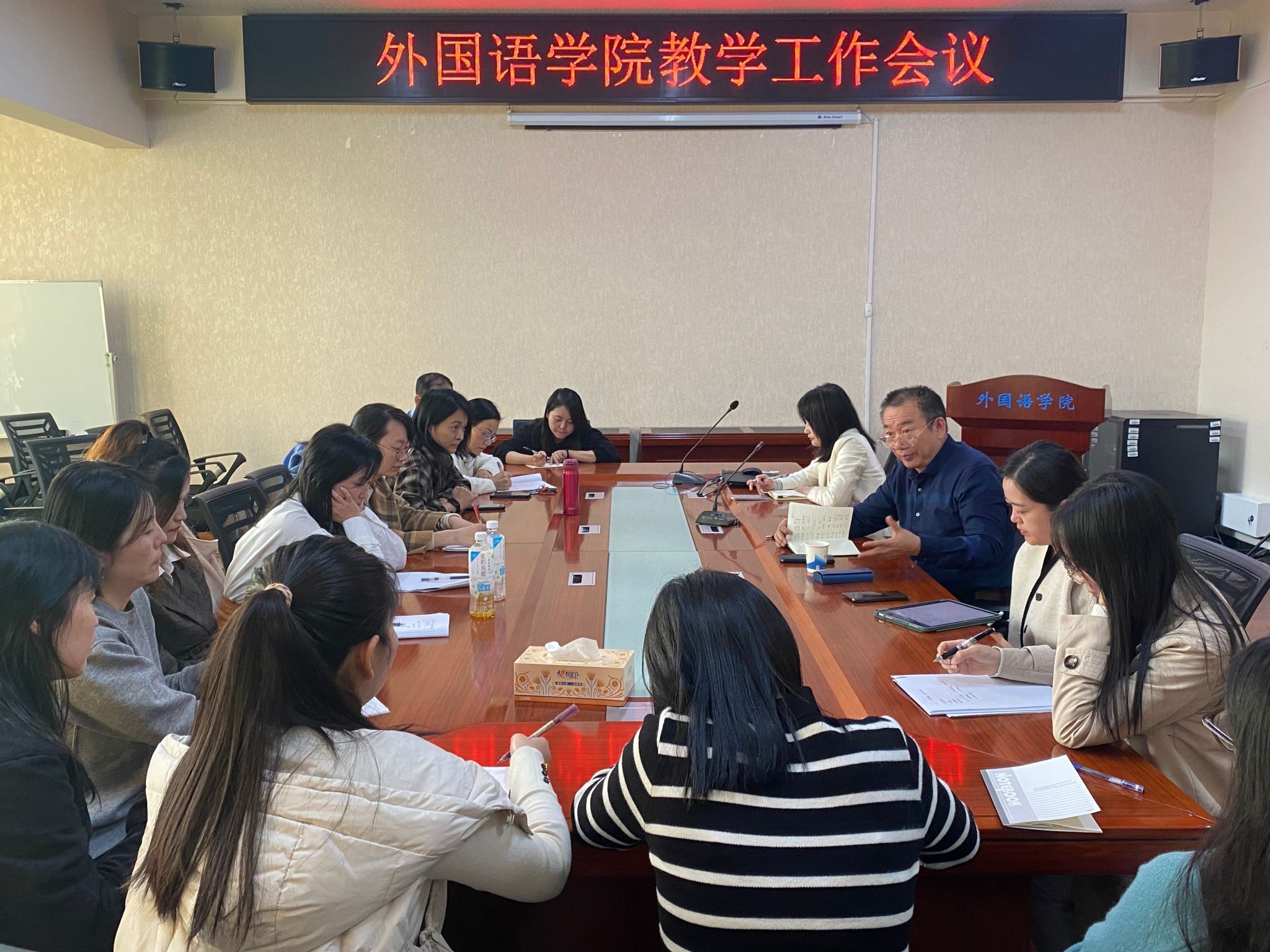 (本网讯)11月21日下午,外国语学院在办公楼315会议室召开教学工作会议。会议由院长刘正光主持,副院长黄越、李曦以及学院部分教师参加。