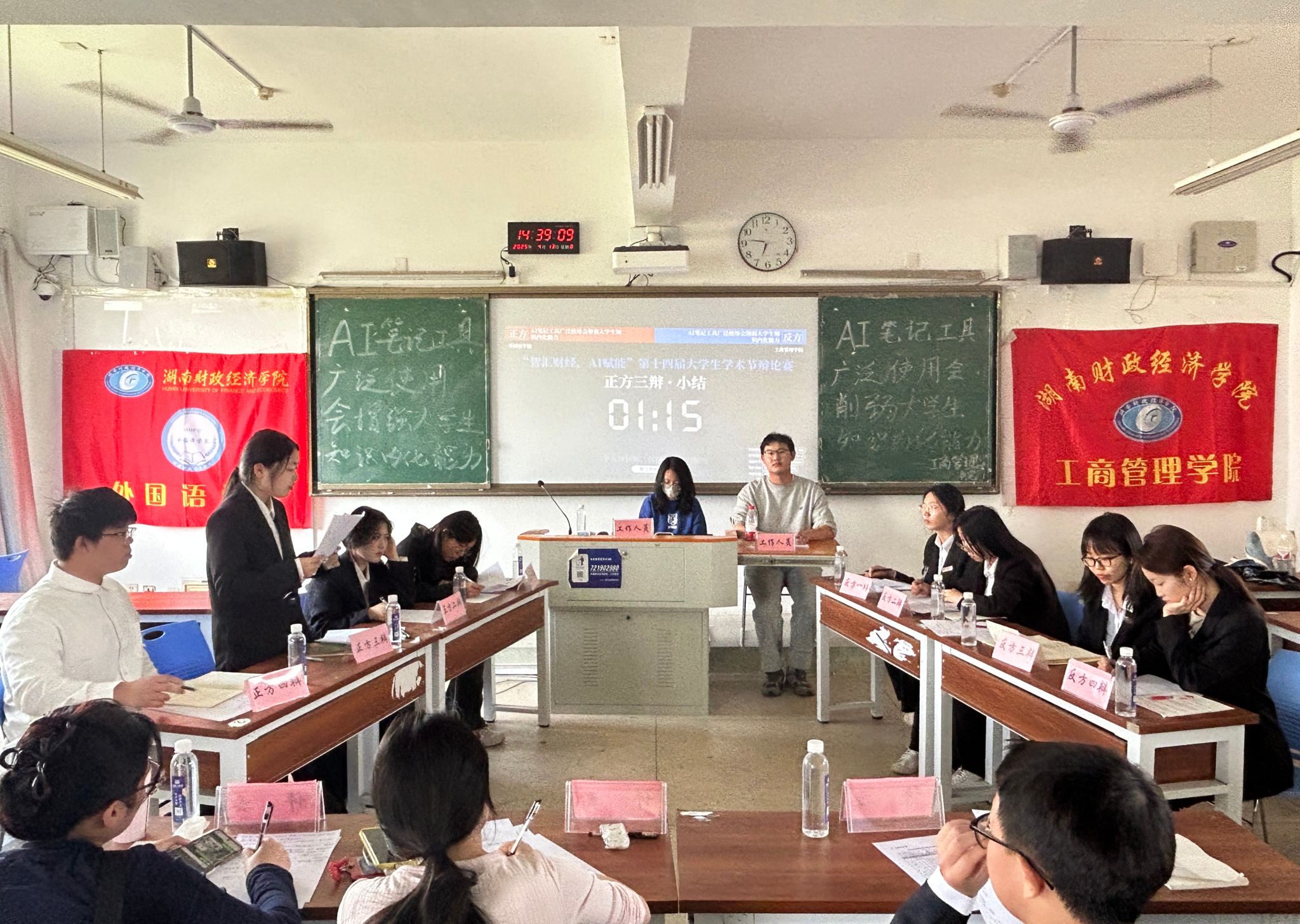作为正方的外国语学院和作为反方的工商管理学院围绕“AI笔记工具广泛使用会增强/削弱大学生知识内化能力”这一辩题展开激烈辩论。