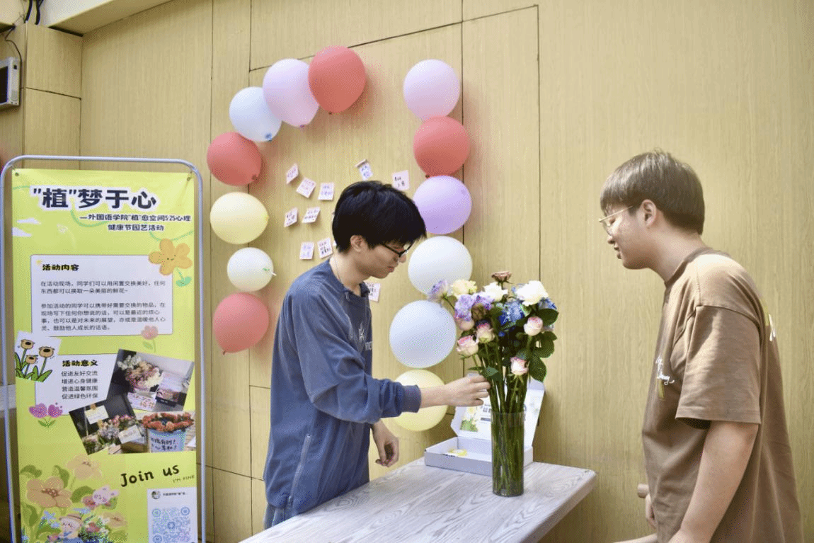 (本网讯)在5•25大学生心理健康日来临之际,为不断加强改进大学生心理健康教育工作,发挥心理健康教育的重要力量,在全院营造关注心理健康的氛围,5月24日下午,外国语学院于主校区阳光房成功举办“植”愈空间——5•25心理健康节园艺活动。外国语学院党委副书记张鹏、学校心理健康中心卿再花老师及学院辅导员马小红老师出席,共百余名同学参与此次活动。