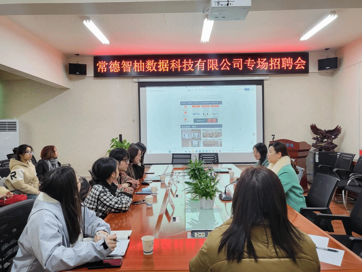 (本网讯)为进一步拓宽毕业生就业渠道,深化校企合作成果,12月23日外国语学院在办公楼315会议室举办了常德智柚数据科技有限公司专场招聘会。本次招聘会旨在为学院2026届毕业生及低年级学生提供优质的实习与就业岗位,学院副院长汪小英、党委副书记张鹏、学工办主任肖叶枝、毕业班辅导员杨舒淇、胡文志以及四十余名学生参加了此次活动。张鹏代表学院对常德智柚数据科技有限公司运营总监杨继富一行的到来表示了热烈的欢迎。