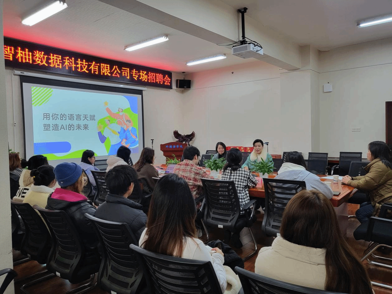 随后,杨继富进行了宣讲详细介绍了公司的发展历程、核心业务以及未来规划,重点解读了公司在人工智能时代下的数据标注等核心业务板块。针对同学们最为关心的福利待遇、职业晋升通道等问题,企业负责人也进行了全面且细致解答,展示了企业对于人才的重视与优厚的留才政策。常德智柚数据科技有限公司是此次学院“访企拓岗”行动中对接的重点企业之一,公司目前亟需具备多语种能力的复合型人才。此次专场招聘不仅为学院学生精准拓展了数字经济相关的就业选择,也标志着学院在探索“外语+人工智能”复合型人才培养路径上迈出了坚实的一步。