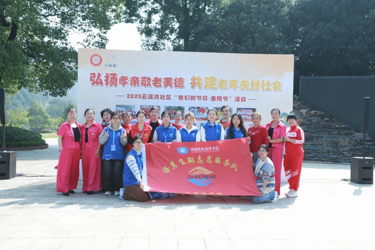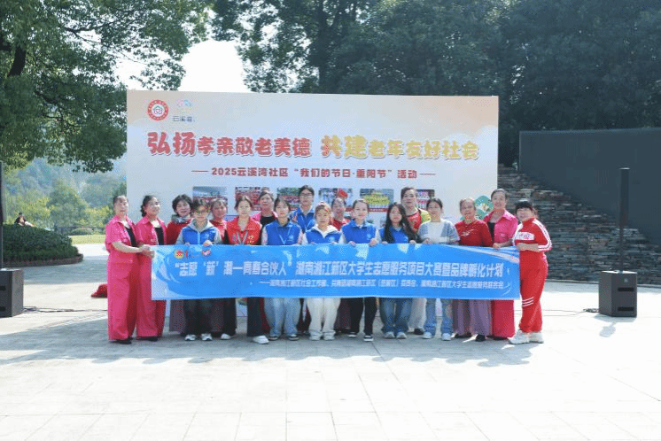 (本网讯)秋阳送暖,丹桂溢香。10月28日,梅溪湖街道云溪湾社区广场热闹非凡,“弘扬孝亲敬老美德 共建老年友好社会”重阳节主题活动在此温情启幕。近400位社区老年演员与200余名居民齐聚,共赴一场兼具文化氛围与公益温度的节日盛会。外国语学院“语翼飞翔”志愿服务队受社区服务中心的委托负责整场活动的后勤服务工作。