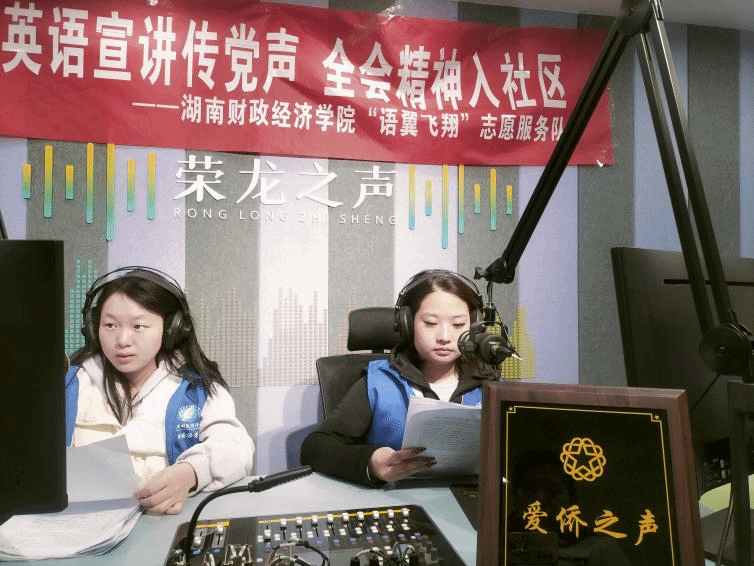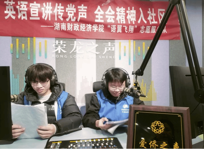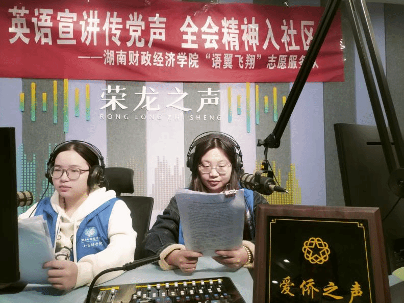(本网讯)11月20日上午,304永利集团登录入口外国语学院“语翼飞翔”志愿服务队的6位志愿者们在学院党委副书记张鹏的带领下走进了岳麓区望月湖街道望月湖荣龙社区,开展党的二十届四中全会精神与“十五五”规划相关政策中英双语宣讲活动。本次活动以社区广播站“爱侨之声”录音播报为主要形式,充分发挥外语专业优势,精心打磨宣讲内容,深入解读党的二十届四中全会精神核心要义,梳理“十五五”规划中与社区居民生活密切相关的民生保障、社区发展、生态环保等重点内容,多维发力提升宣讲实效,让政策红利真正飞入寻常百姓家。