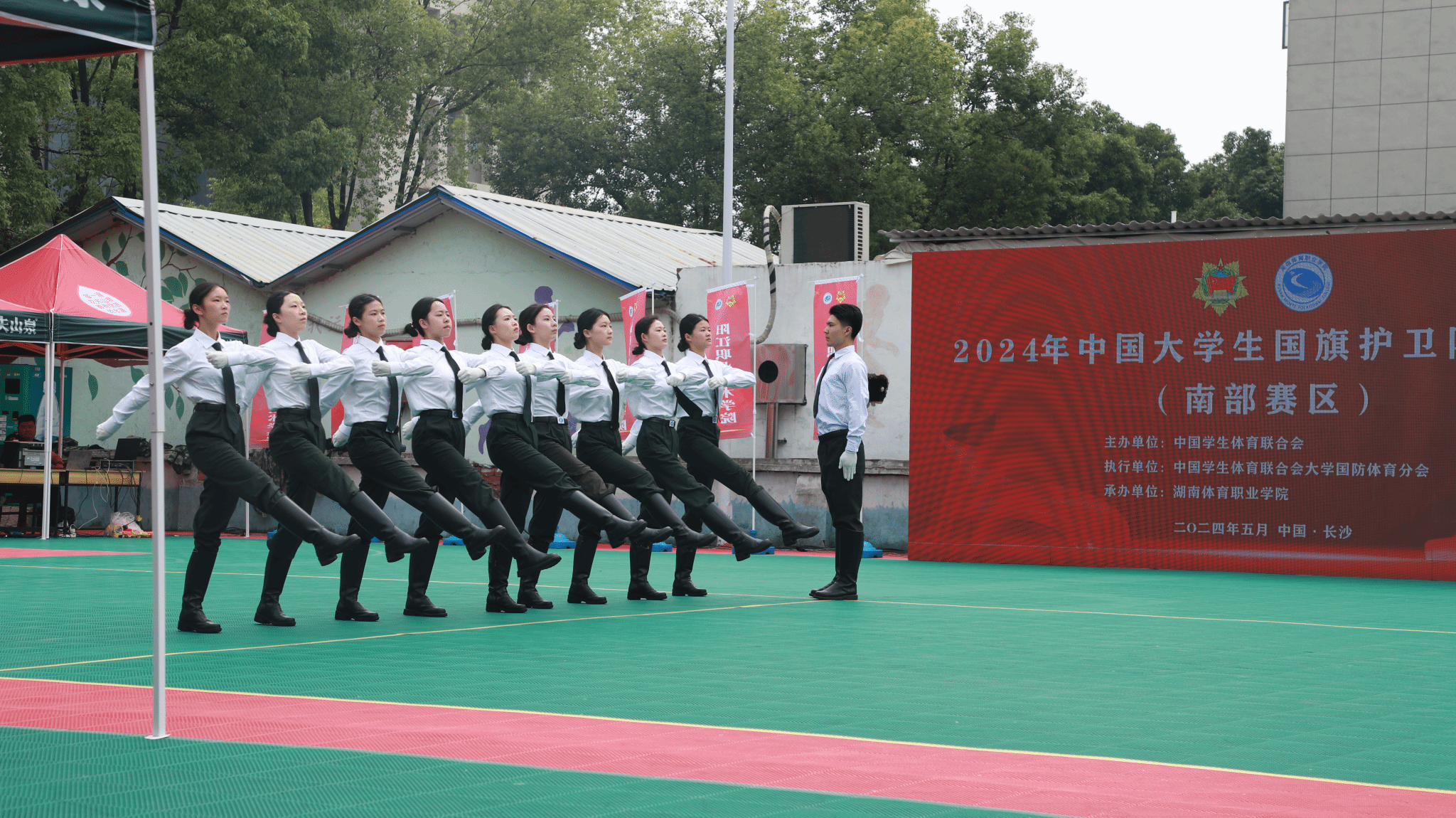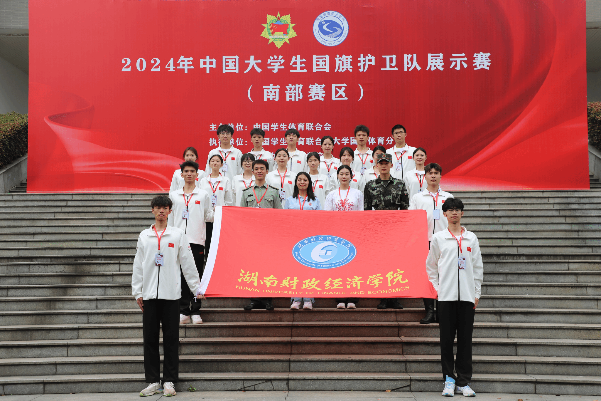 本次大赛由中国学生体育联合会主办,湖南体育职业学院承办,共有来自南部六省的24所高校代表队参赛。比赛分为甲组(本科组)、乙组(高职高专组),开展升旗展示、队列动作两个项目竞赛,赛期为2天,期间还开展了红色研学等活动。