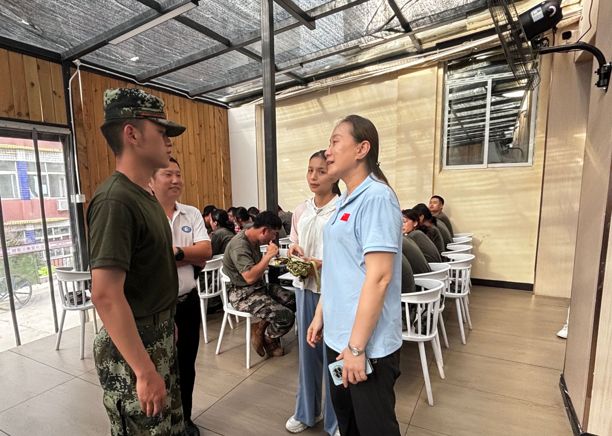 苏玲与队员们亲切交谈,关切地询问了其中一名身体不适的队员的身体情况,叮嘱其注意休息,劳逸结合,并嘱咐后勤工作人员及时为队员们准备凉茶等解暑物资。
