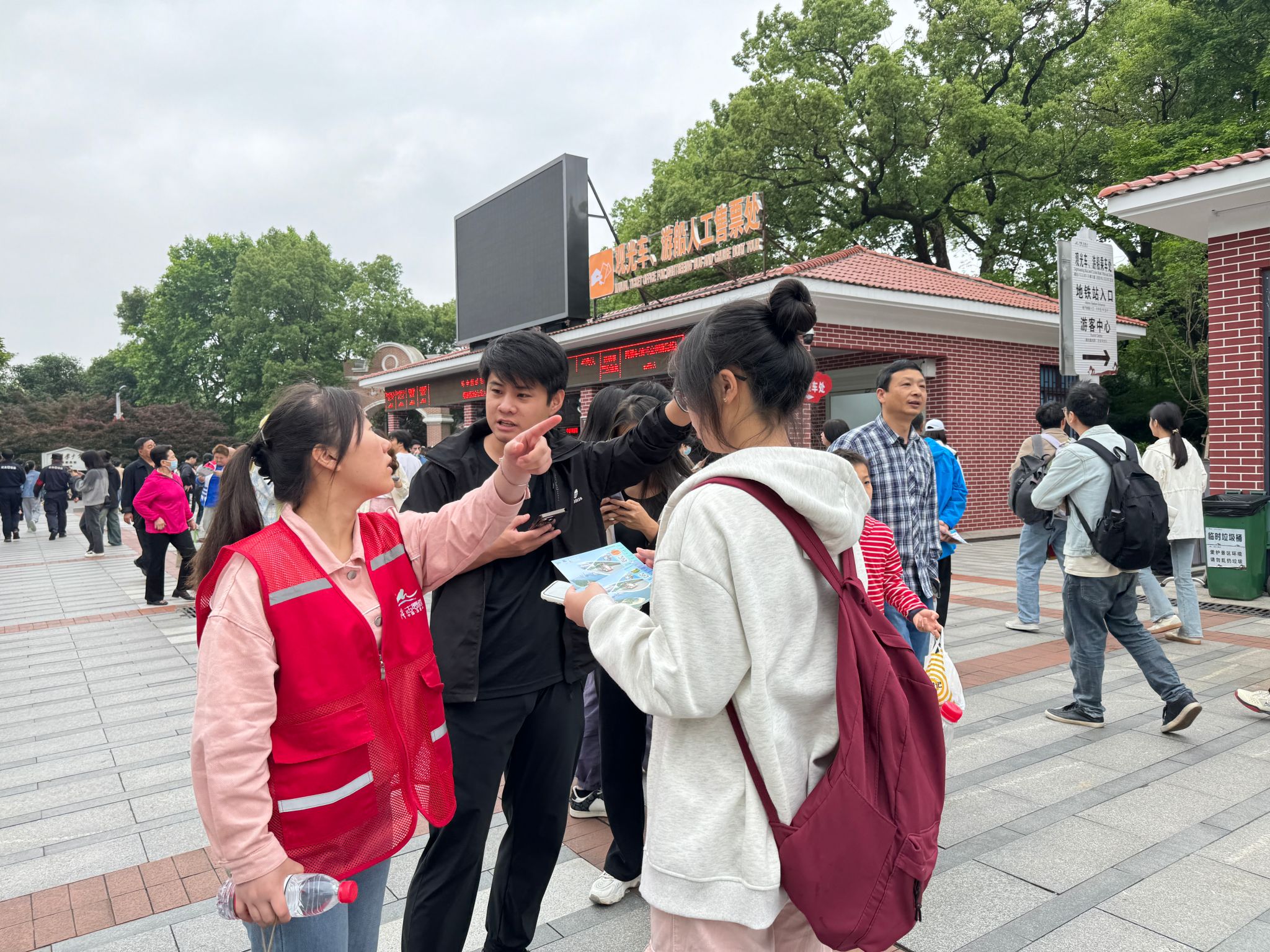 在景区地铁出口,永利志愿者邹慧玲为游客提供旅游咨询服务