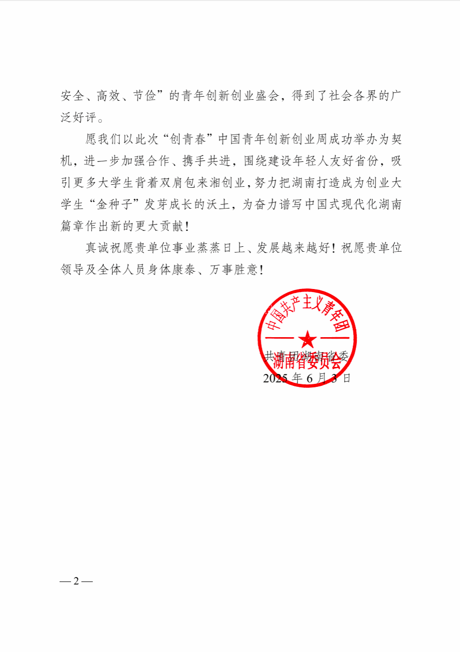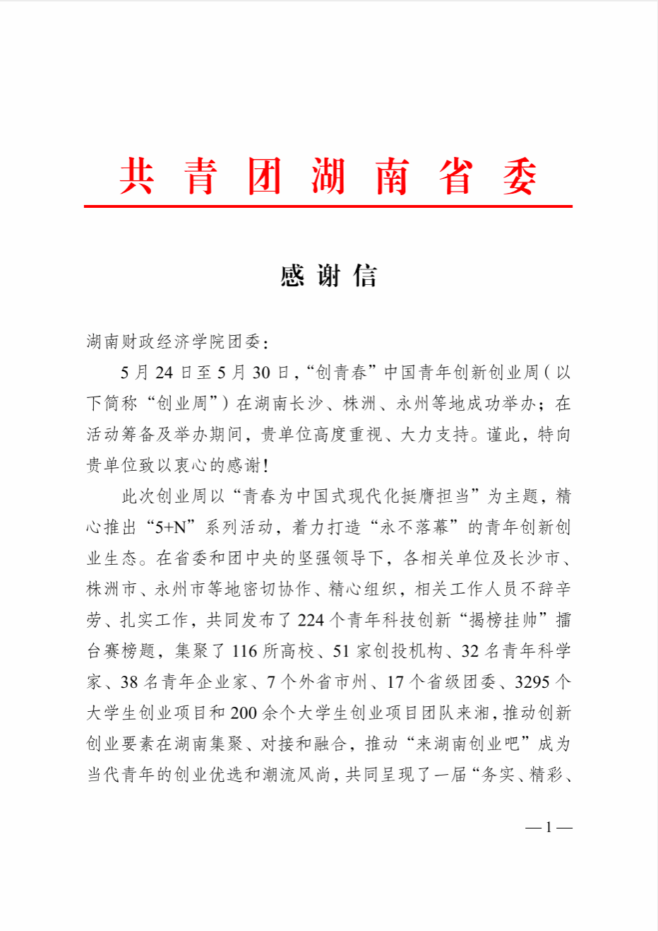 共青团湖南省委致304永利集团登录入口关于“创青春”中国青年创新创业周的感谢信