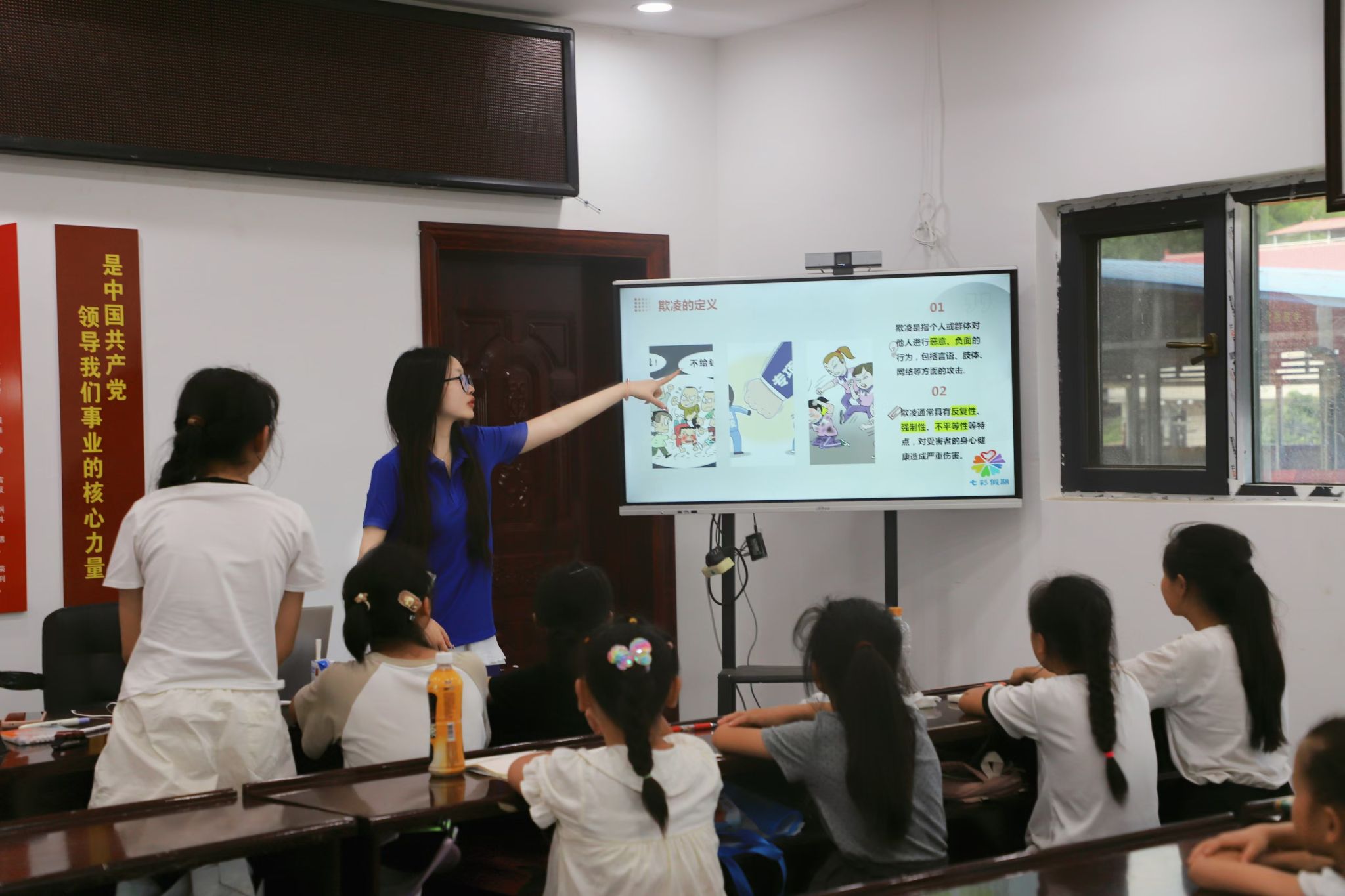 同衿志愿队以留守儿童心理健康与弱势群体关怀为重点,开展了防溺水、防性侵等特色课程与团体心理辅导活动并调研儿童与老人的生活情况,建立弱势群体关爱服务机制;会青春志愿服务队从“情”——人才培养现状、“清”——三资管理情况、“晴”——产业实际发展程度三个方面开展调研,以青春“红”助力乡村“绿”;语翼飞翔志愿服务队围绕“保护女童权益,关爱儿童成长”在当地开展防性侵、防溺水、爱国主义教育及非遗课程,让孩子们在进行理论学习的同时增强对非遗文化的认同感。