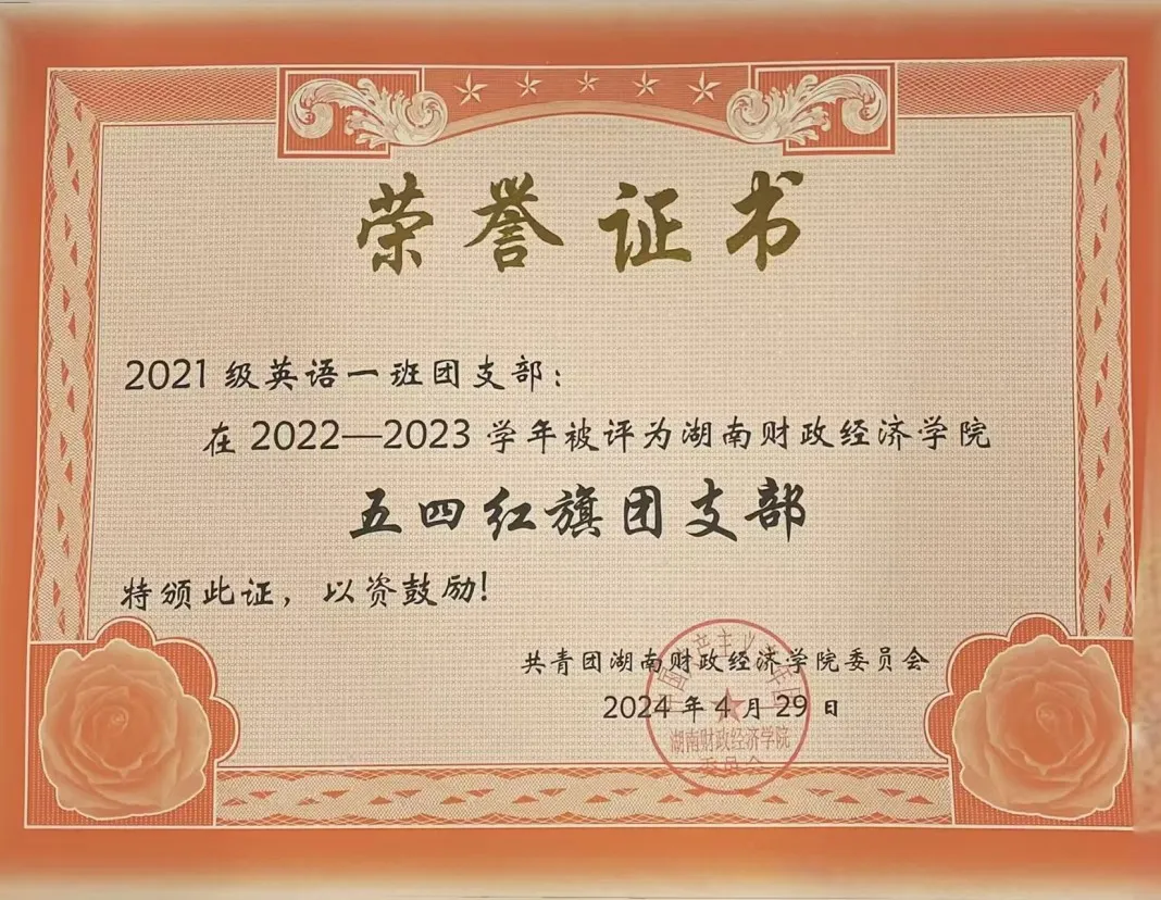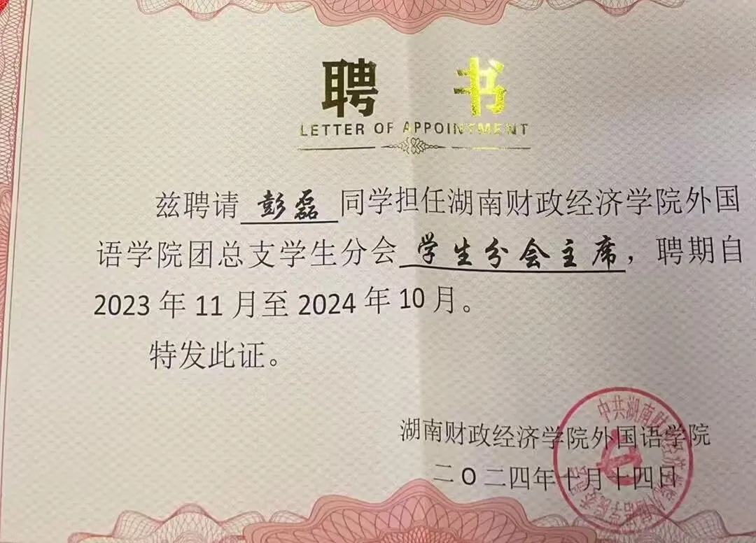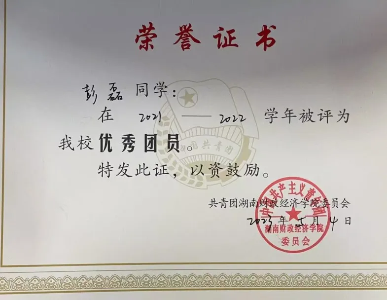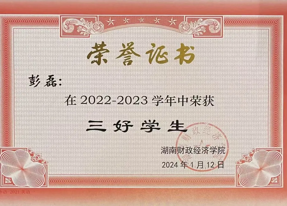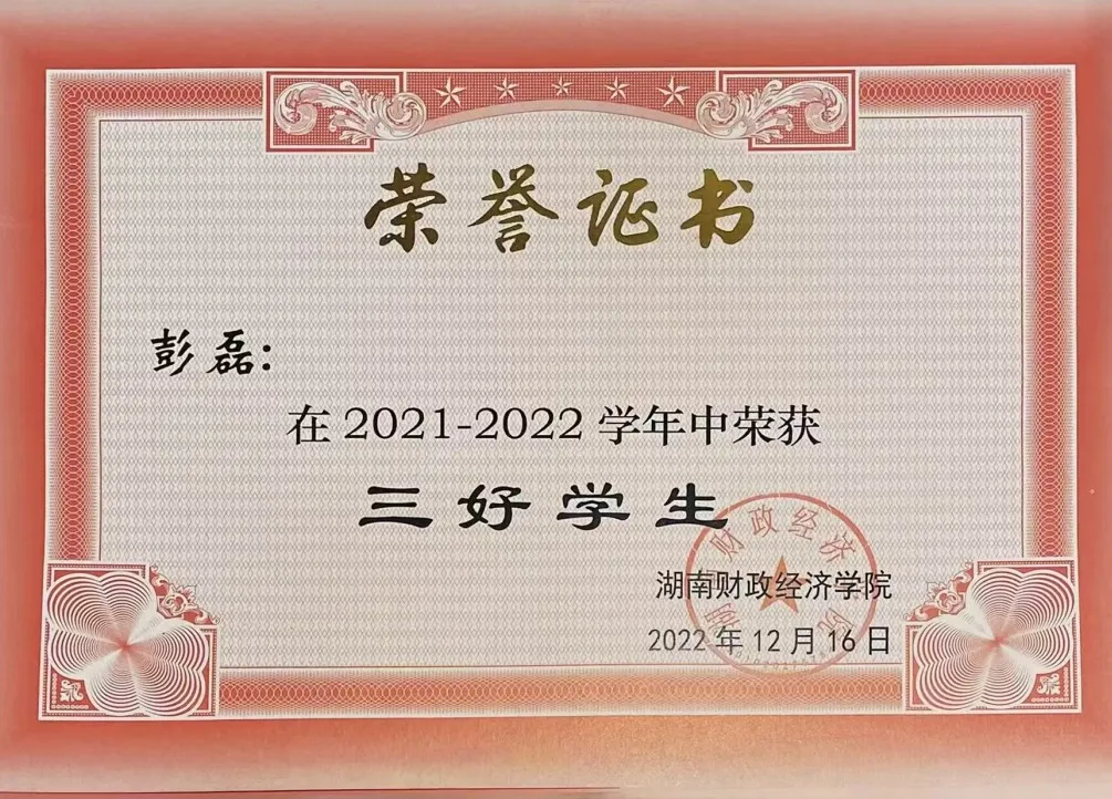 团员推优25人。班级先后被评为“先进班级”、“五四红旗团支部”等荣誉称号,彭磊本人荣获校“芙蓉学子·道德风尚奖”。其次,于2023年10月开始担任外国语学院团学会主席一职,在主席团成员和团总支书记的带领下,先后成功举办了院级“我讲中国故事”主持人大赛、中华民族共同体意识演讲比赛、外国语学院特色节日女生节等多项丰富学生文化、物质、精神生活的活动,得到了学校里师生的一致好评。“为山者,基于一篑之土,以成千丈之峭;美德行者,始于细微之行,以铸高尚之魂”。彭磊同学正如那默默堆积山石的工匠,从点滴美德做起,不断积累,逐渐形成了深厚的道德底蕴。
