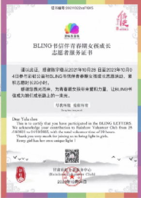 她,积极投身社区实践,磨砺自身,奉献社会。自大学起,便活跃于各类志愿服务活动。从上海国际时尚艺术节到彩虹公益社的书信伴女孩行,再到robotex世界机器人大赛,她不仅是参与者,更是裁判组组长,以专业与热情赢得了“优秀志愿者”称号。