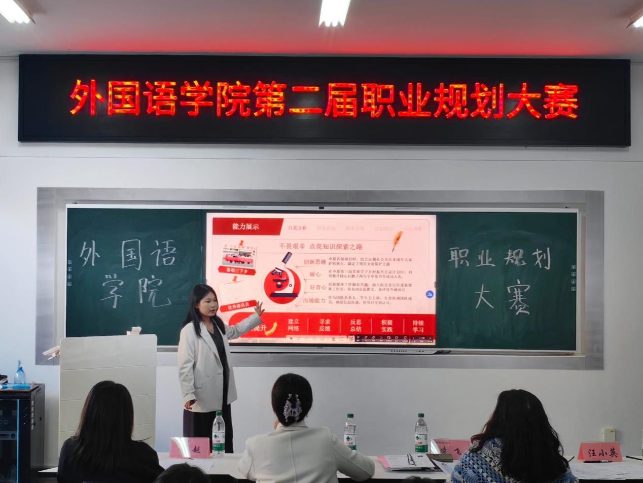 为增强大学生职业生涯规划意识,引导大学生科学合理地规划学业与职业发展,促进未来高质量就业,外国语学院于11月28日在主校区办公楼317室举办第二届大学生职业规划大赛学院复赛。本次大赛由外国语学院党委书记凌飞、副院长汪小英、副院长黄越、党委副书记张鹏担任评委。