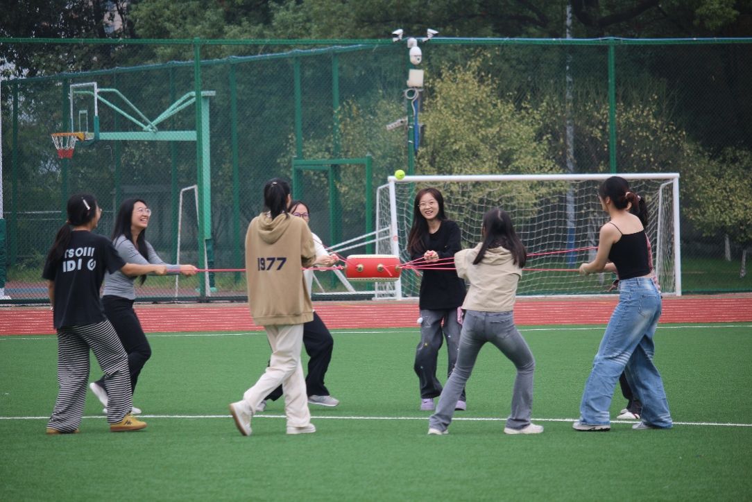 赛事环节亮点纷呈。“同心协力,共赴胜利”中,双人绑腿竞速,步伐协同间诠释默契;“紧密配合,冲破险阻”里,八人跳绳团队争分夺秒,节奏与力量交织;“擂鼓助威,士气昂扬”时,鼓绳操控精准颠球,专注凝聚团队合力;“凝聚力量,力拔山河”中,拔河队伍奋力拼搏,标记线的移动见证集体意志。裁判严守公平准则,工作人员保障赛事顺畅,全程记录竞技瞬间。