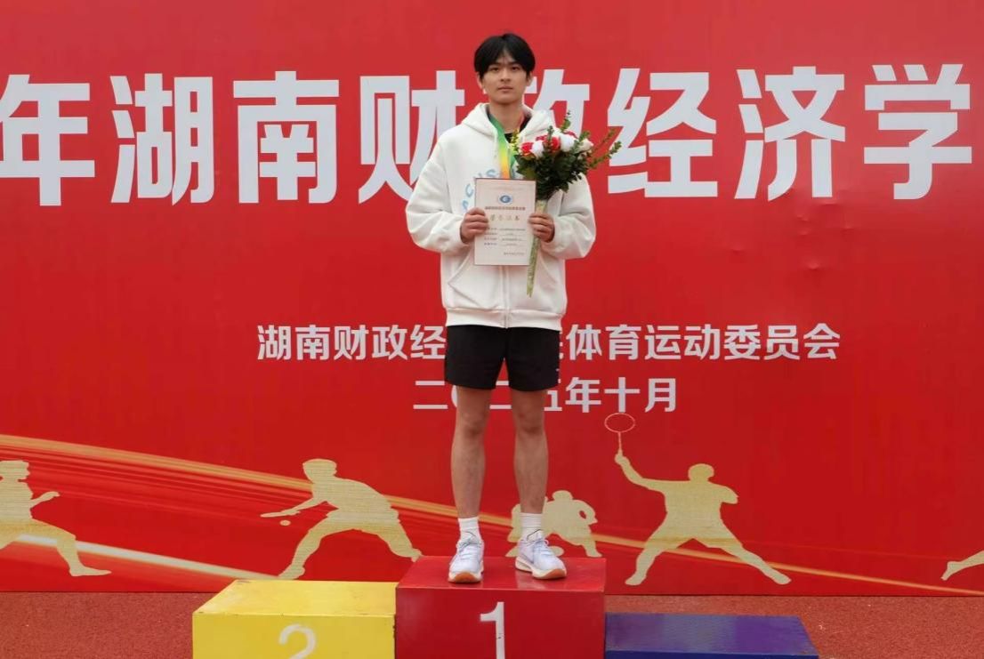 图为文浩骅同学荣获男子跳高第一名打破校运会记录
