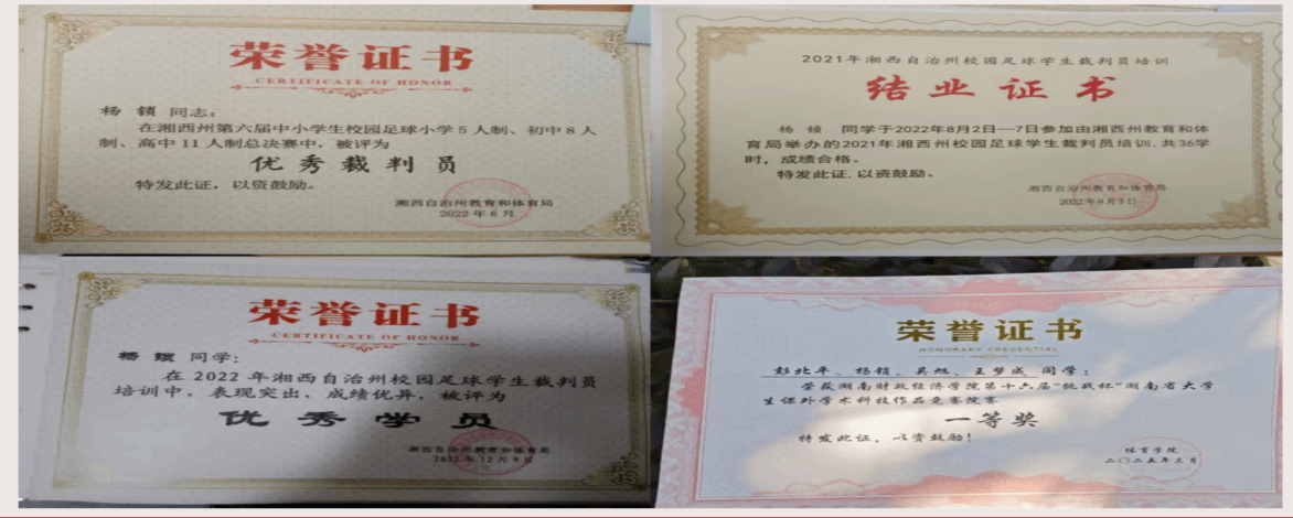 积极投身校内外实践活动,在2021年湘西自治州校园足球学生裁判员培训中获评“优秀学员”,在湘西自治州校园足球总决赛中被评为“优秀裁判员”;参与304永利集团登录入口第十届学生课外学术科技作品竞赛,荣获院级一等奖。凭借在校园营地帐篷节中的突出表现获评“先进个人”,在实践中不断提升综合素养,用实干诠释责任担当。
