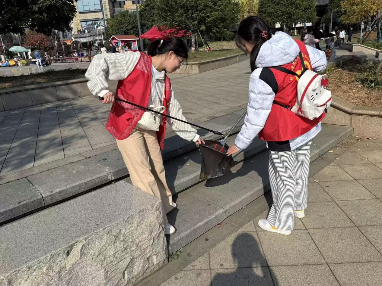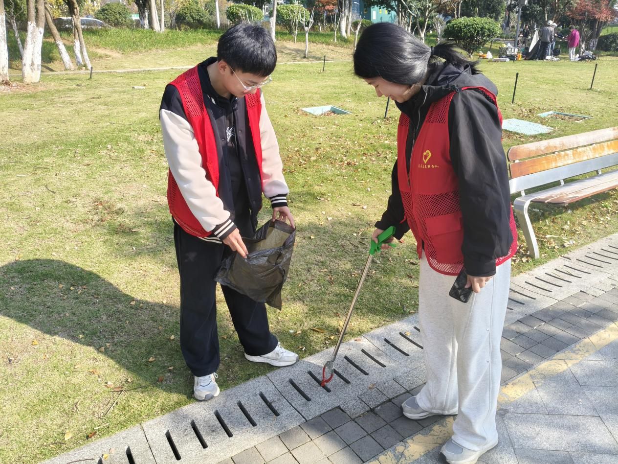 活动伊始,经队长简易分工,队员们迅速两两结对,沿湖畔步道、草坪及亲水平台等预设路线有序推进。大家各司其职,专注投入,志愿服上“星辰”二字在阳光下熠熠生辉,志愿者们忙碌的身影宛如点点星光,为冬日湖畔增添了别样朝气。