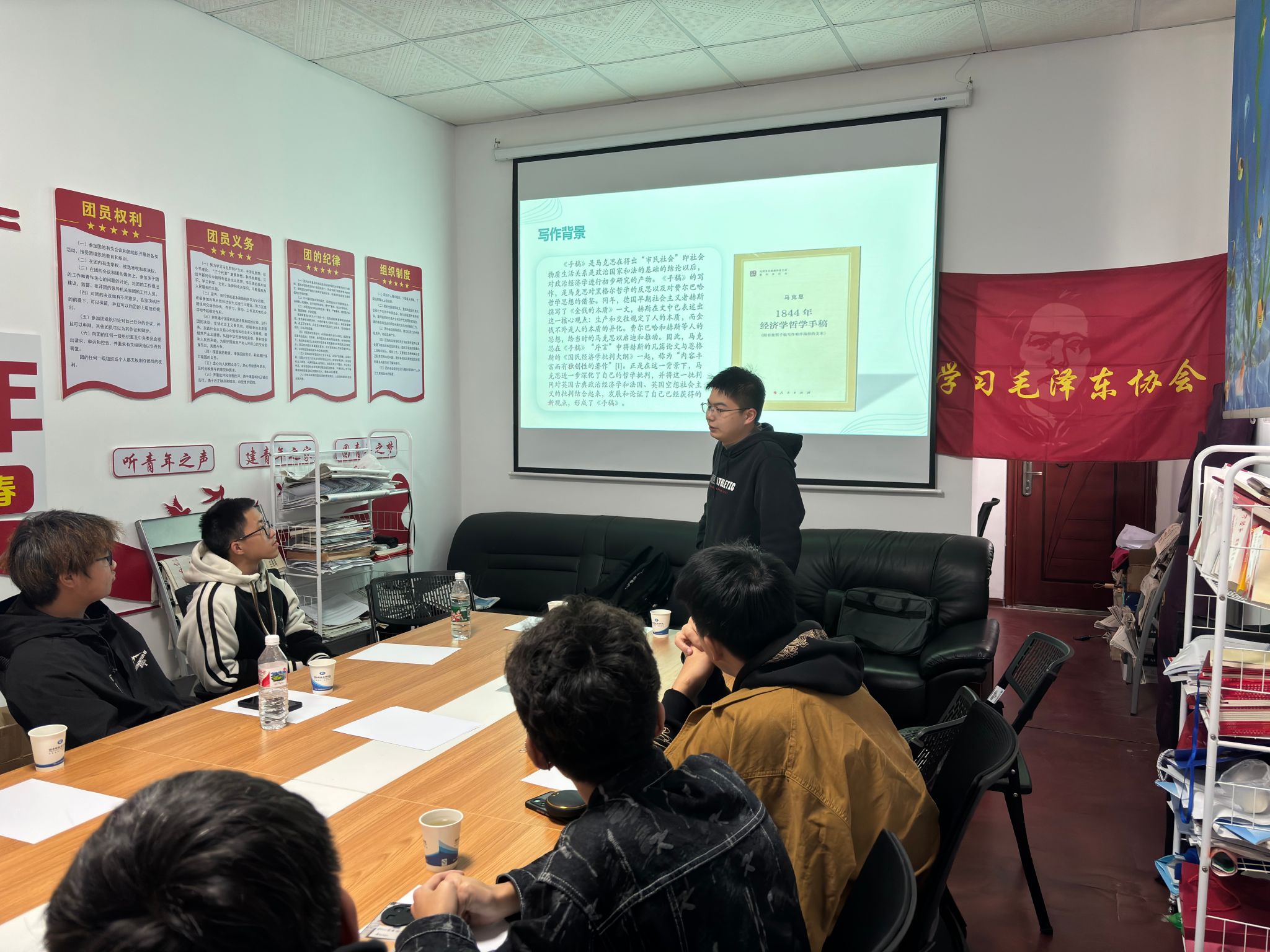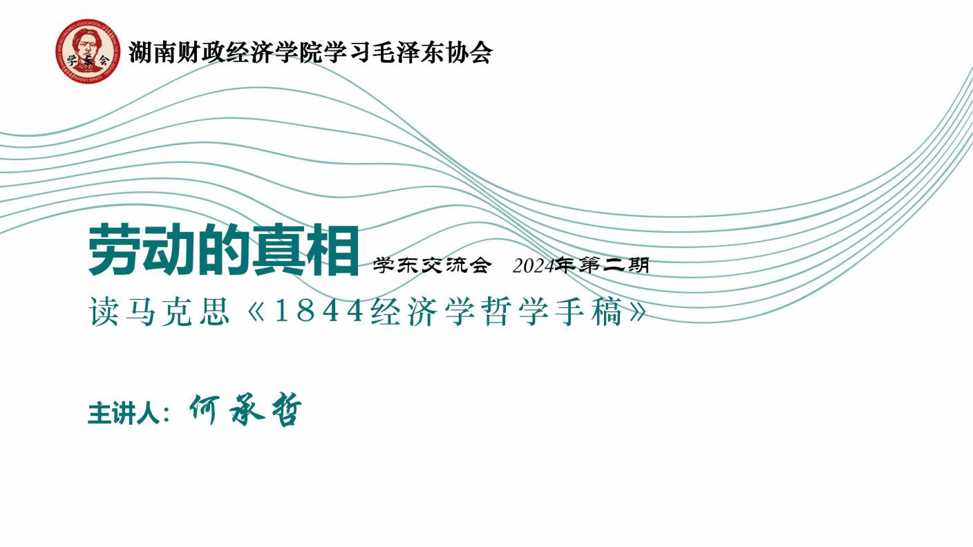 2024年3月17日下午14时,永利学习毛泽东协会在大礼堂三楼会议室如期举行了2024年第二期学东交流会。本次交流会的主题是《劳动的真相——读马克思<1844经济学哲学手稿>》,由学东会会长何承哲同学担任主讲人。此外,来自湖南第一师范学院的罗奕欣、殷天怡两位同学作为外校嘉宾出席了此次活动。