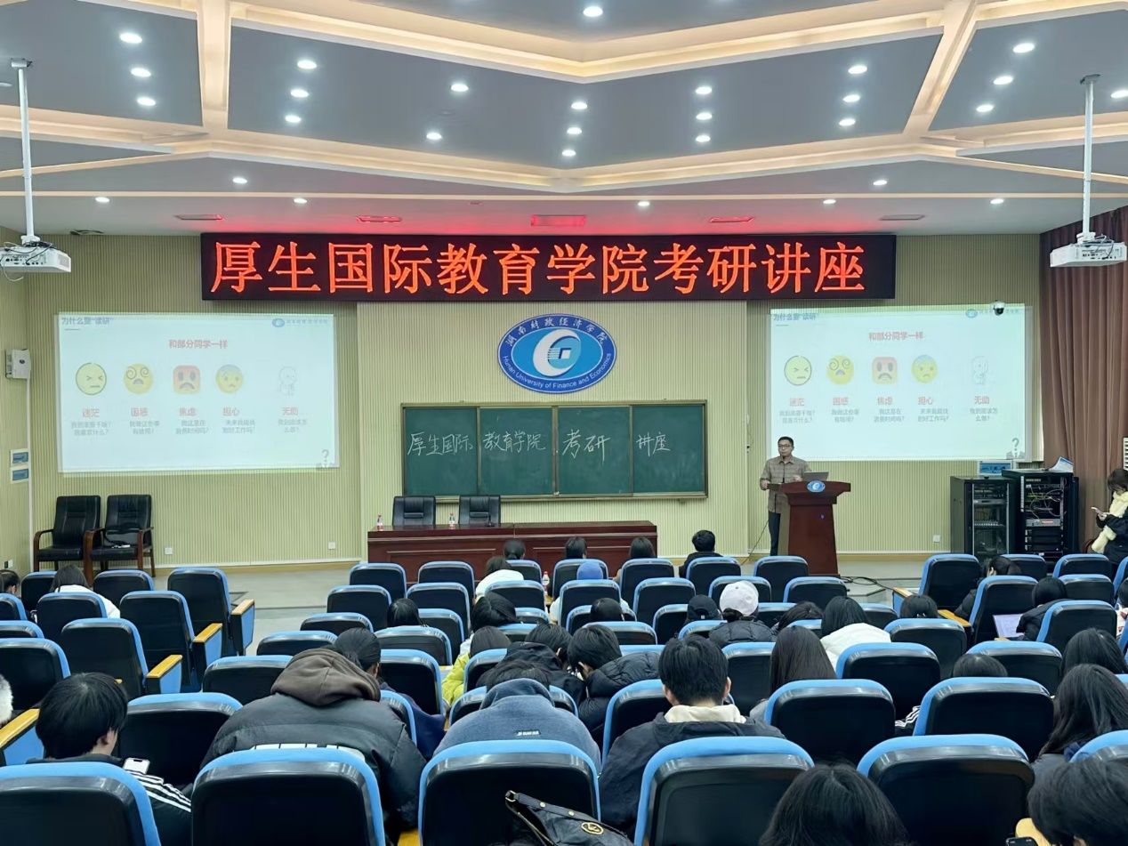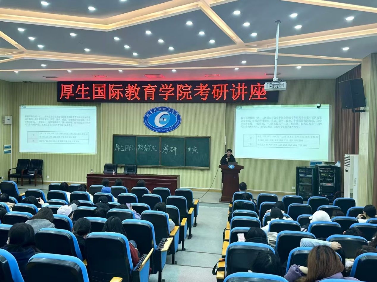 为进一步帮助考研学子明确目标、树立信心,提高复习效率,同时促进考生之间的合作交流,厚生国际教育学院于12月11日下午14:00-15:40在2J02教室举办以“智慧破茧,研时成蝶”为主题的考研讲座。本次分享会特别邀请王超、肖云鹏两位老师为我院学子们分享考研经验,出席本次考研分享会的还有院党支部书记肖平飞、国际合作与交流处综合科科长马艳、院教务办主任陈爽以及各位备战考研的学子们。